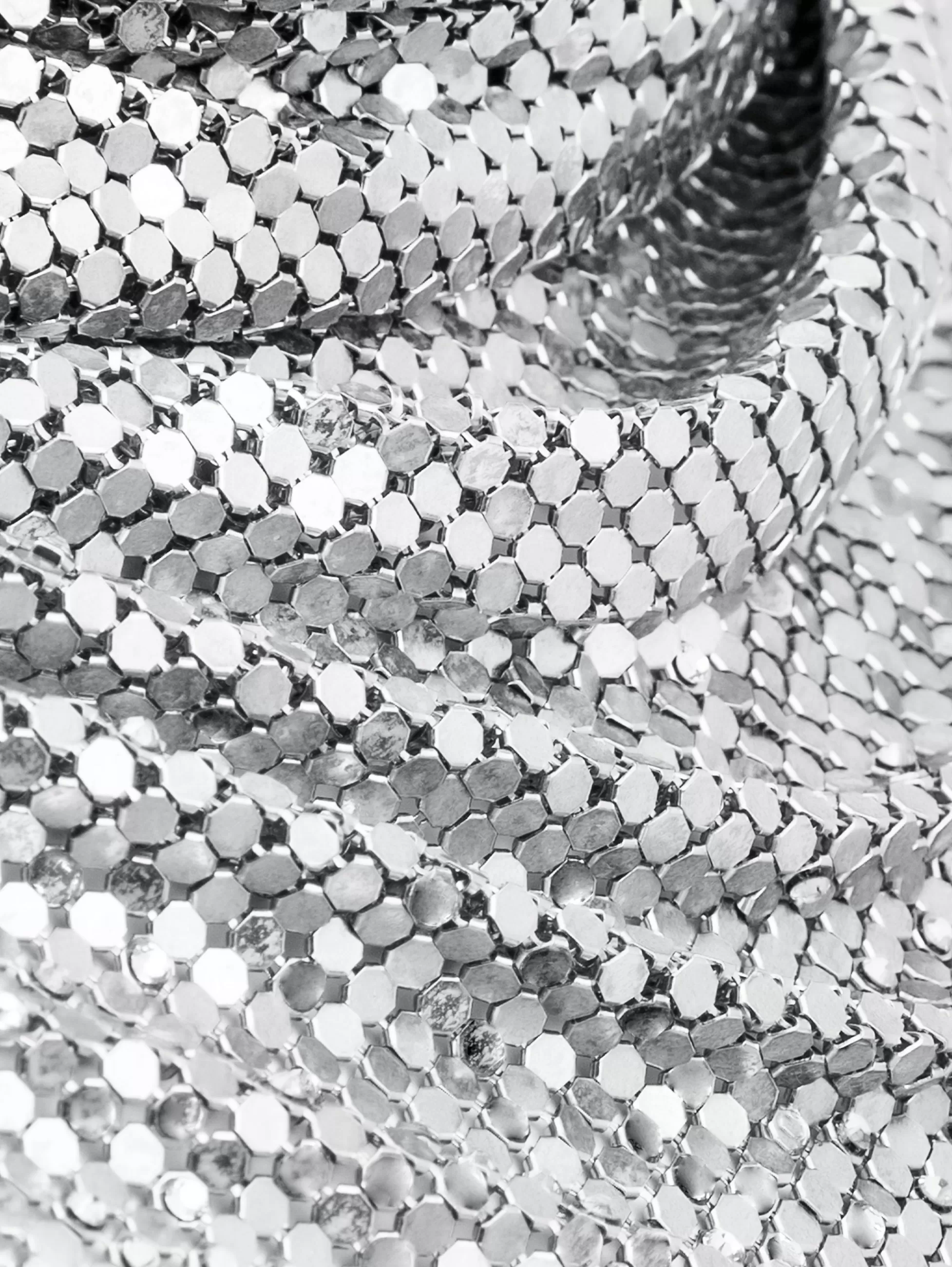 Confectionnée en métal argenté poli, l’écharpe cotte de mailles Pixel est dotée d’une fermeture à bouton-pression et d’un motif cotte de mailles qui réinvente l’écharpe cotte de mailles métallique de Rabanne avec un design épuré.