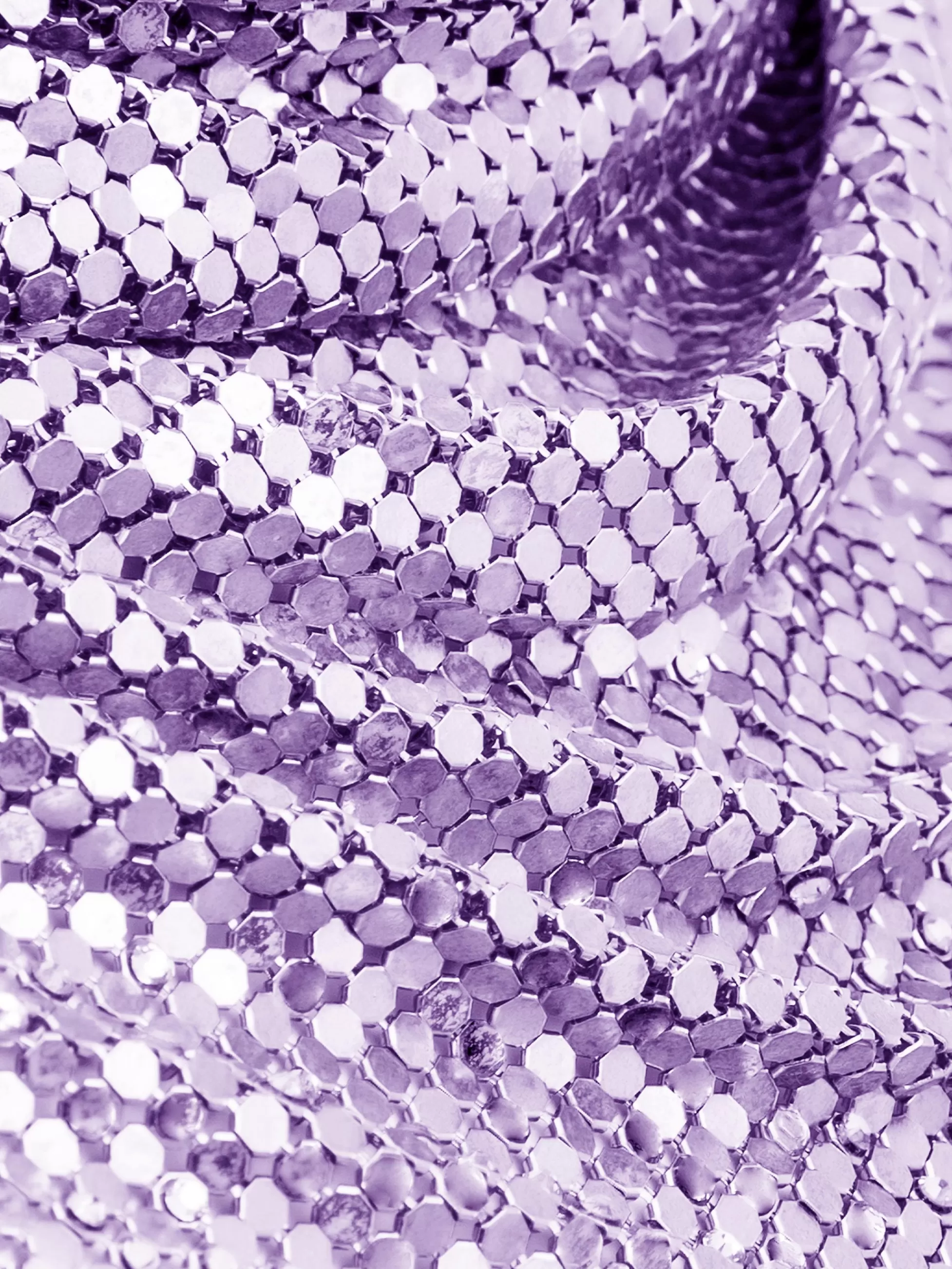 Confectionnée en métal poli de couleur pourpre, l’écharpe Pixel en cotte de maille est dotée d’une fermeture à bouton-pression et d’un motif en cotte de mailles qui réinvente l’écharpe métallique de Rabanne avec un design épuré et une nouvelle couleur vive.