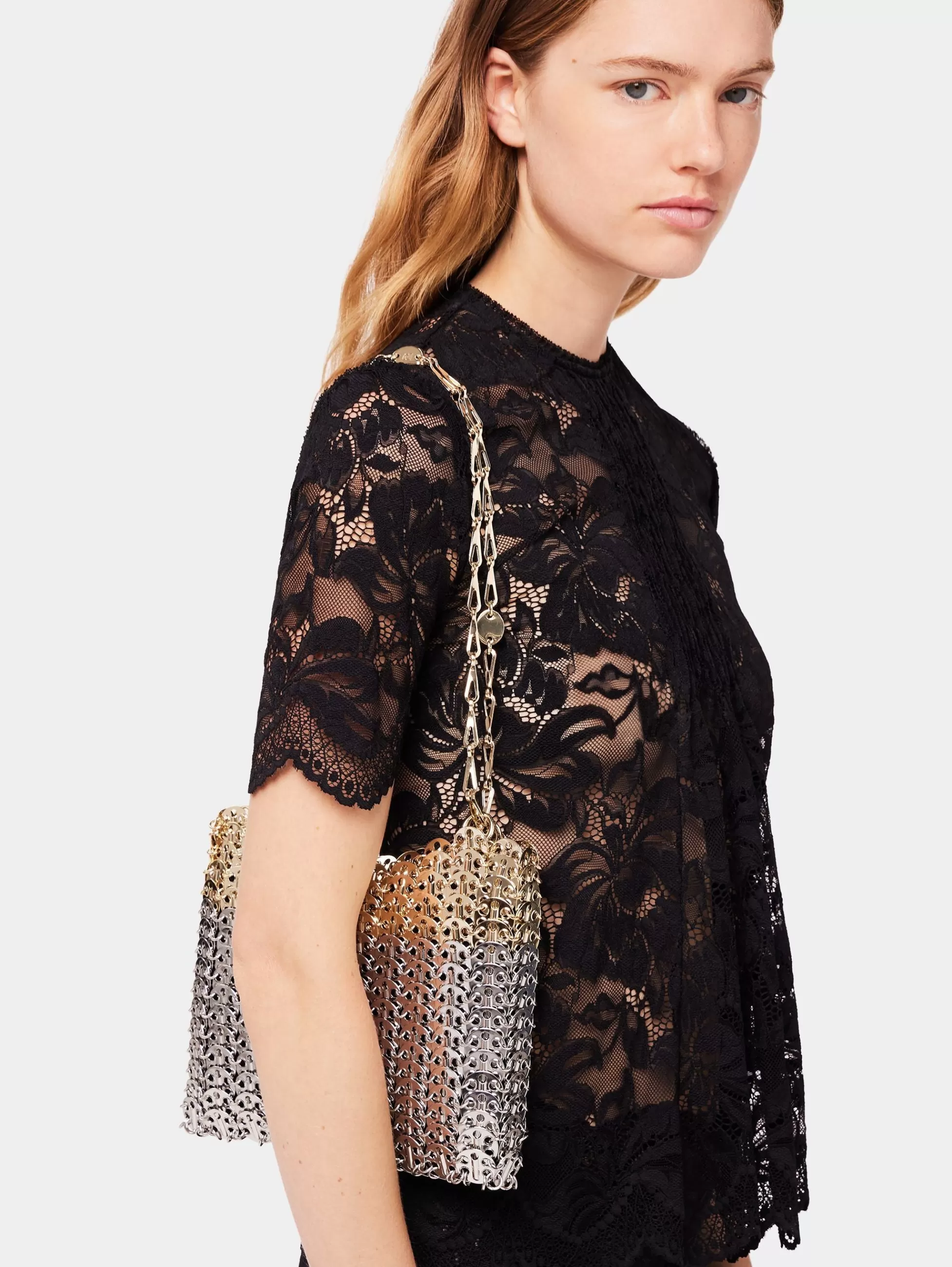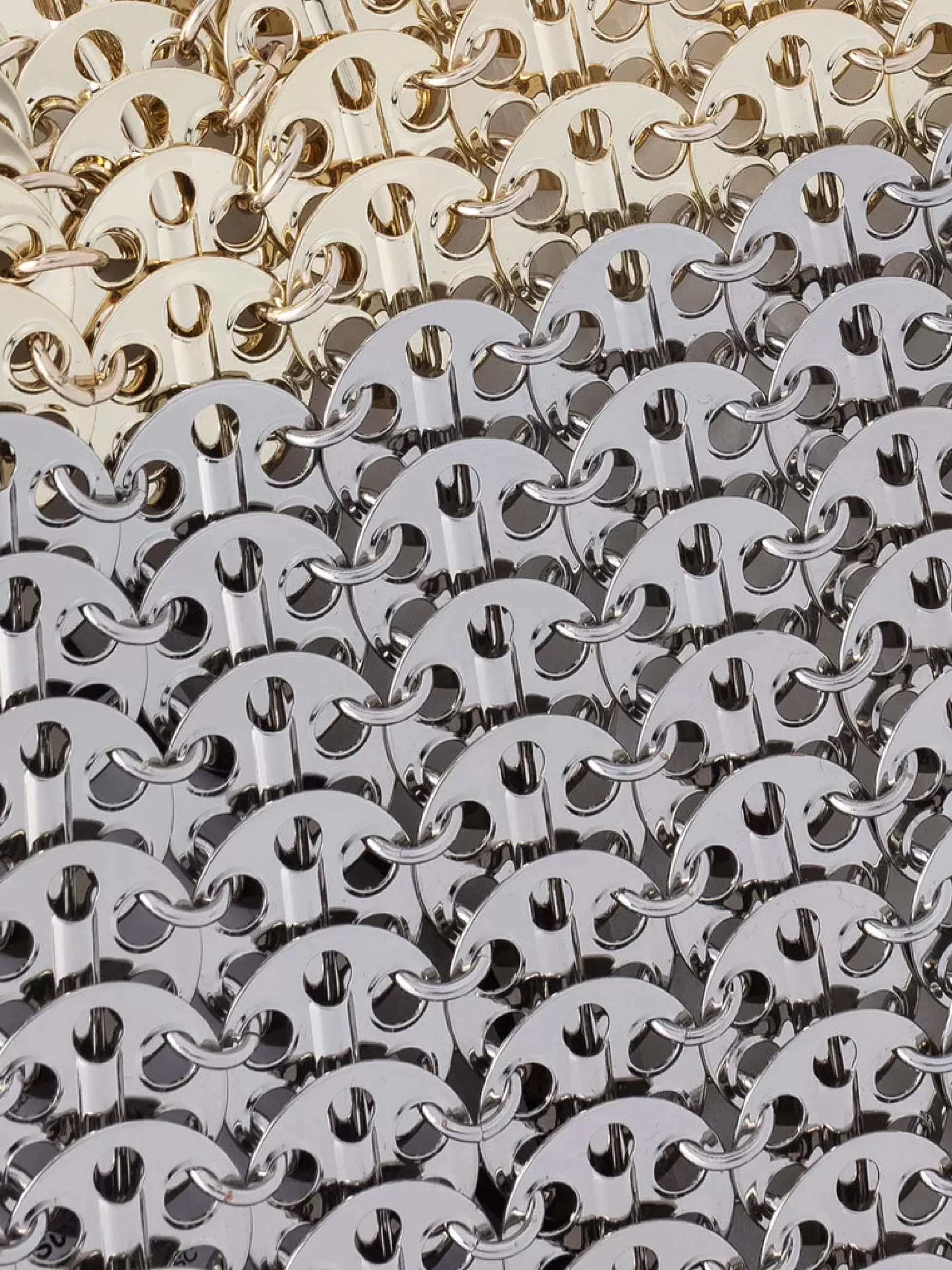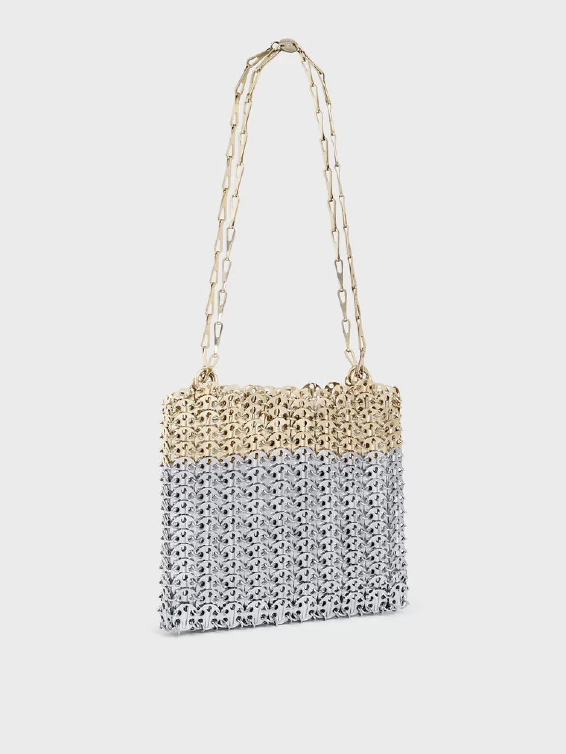 Relance du sac Iconique 1969. Ce sac en or et argent rayonnant est un véritable reflet de l’identité et de l’expertise de la Maison Rabanne. Le sac pliable skyline est une fabrication unique de 367 pastilles dorés et argentés collés par des anneaux métalliques.